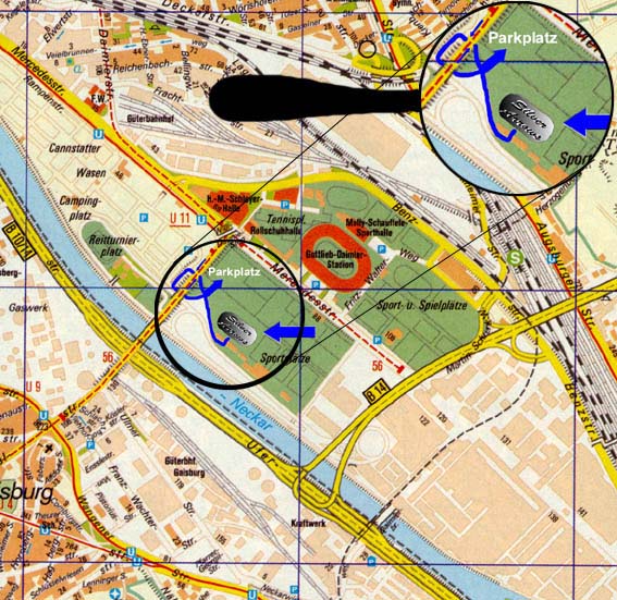 Bei der Anfahrt einfach den Schildern Richtung Bad Cannstatt und zum Stadion folgen. Unsere Spielstätte befindet sich dann zwischen dem Gottlieb-Daimler-Stadion und dem Cannstatter-Wasen, zu erreichen über die Gaisburgerstraße - siehe Plan unten.